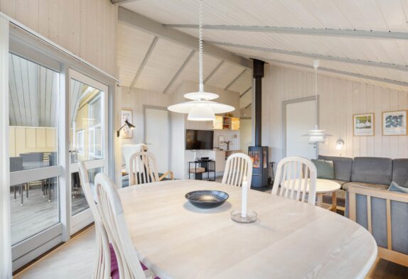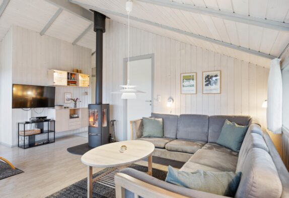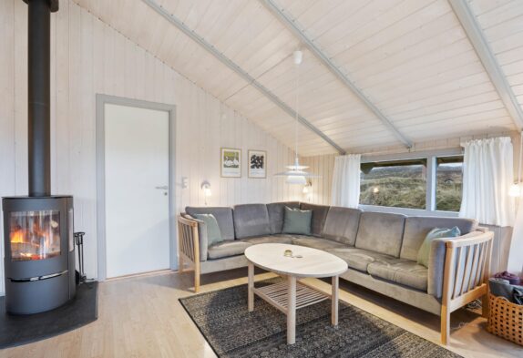 Durch die offene und gut ausgestattete Küche gelangt ihr zum Mittelpunkt des Sommerhauses – dem mit viel Liebe zum Detail eingerichteten Wohnraum. Hier erwarten euch hohe, helle Decken, gemütliche Sitzmöbel und ein knisterndes Kaminfeuer, welches zur hyggeligen Atmosphäre beiträgt. Verbringt einen geselligen Spiele- oder DVD-Abend und genießt die Wärme. Zusätzlich könnt ihr aber auch mit der energiesparenden Wärmepumpe heizen.