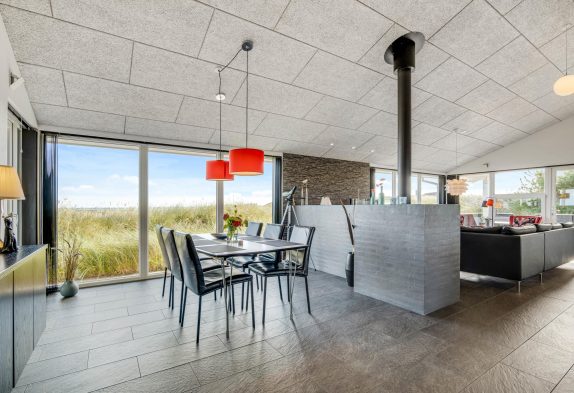 Der großzügige Wohnbereich besticht durch eine moderne Ausstattung mit hohen Decken und großen Fenstern, die den offenen Wohn-Essbereich erhellen. Von der bequemen Sofalandschaft genießt ihr einen wunderschönen Panoramablick in Richtung Ringkøbing Fjord. Ein Fernseher und ein Kaminofen laden zu gemütlichen Abenden ein. Eine Halbmauer trennt den Stubenbereich stilvoll vom Esszimmer.