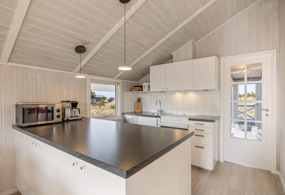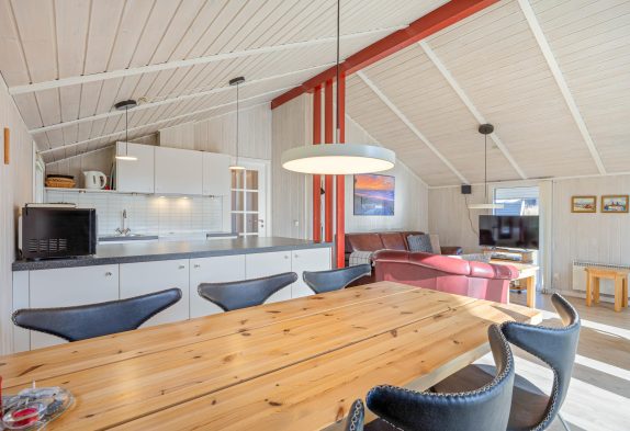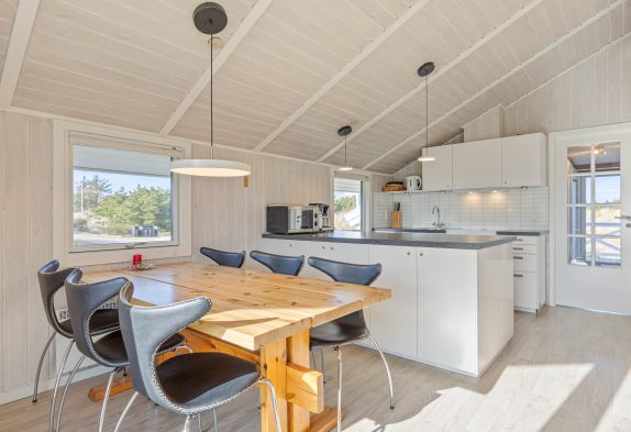 Der schöne Wohnraum strahlt Gemütlichkeit und Wärme aus. Hier könnt ihr vorm Kamin ein Buch lesen, während eure Kinder am Esstisch ein Spiel spielen oder eine DVD schauen. Auch mit der energiesparenden Wärmepumpe könnt ihr das Ferienhaus schnell und einfach heizen. Die moderne Küche ist offen zum Wohnraum gestaltet und mit allem ausgestattet, was das Herz begehrt. Dank der Kücheninsel habt ihr auch Platz für einen gemeinsamen Kochabend. Der Geschirrspüler kümmert sich im Anschluss um den Abwasch. So könnt ihr den Abend in geselliger Runde ausklingen lassen.