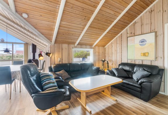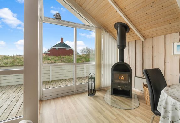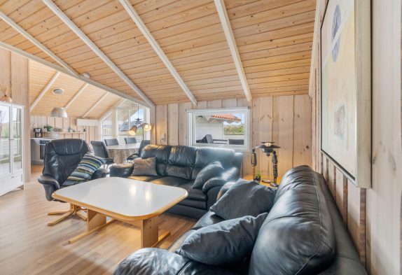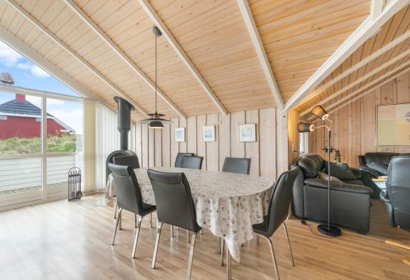 Der helle, offene Wohnbereich mit seinen sichtbaren Dachbalken und der großen Fensterfront bildet das Herz des Ferienhauses. Hier kannst du es dir auf den gemütlichen Sofas bequem machen und bei einem Filmabend den Fernseher mit DVD-Player nutzen. Der Kaminofen sorgt für zusätzliche Gemütlichkeit, während die Wärmepumpe für Wohlfühltemperaturen sorgt. Die Essecke lädt zu gemeinsamen Mahlzeiten oder einem spannenden Spieleabend ein.