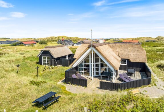 Ein reetgedecktes Ferienhaus, aus den besten Materialien gebaut und ausgestattet, in bevorzugter Lage, auf einem Dünengrundstück an der ersten Reihe, bevor es zum Strand geht. Vom Haus und der Terrasse hat man einen wundervollen Blick auf die Dünen.