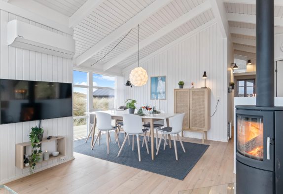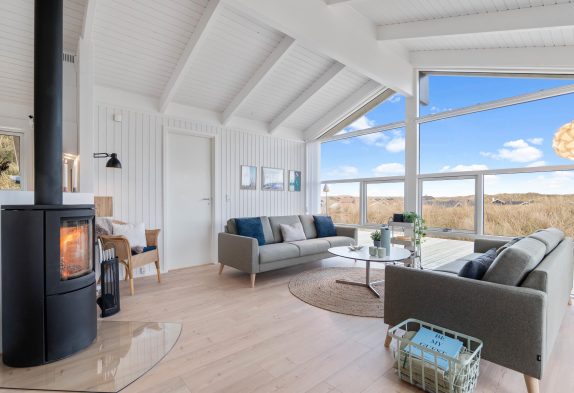 Den Mittelpunkt dieses typisch skandinavischen Ferienhauses bildet der offen gestaltetet Wohn- Essbereich mit angrenzender, offener Küche. Dank der Panoramafenster habt ihr eine einmalige Aussicht und es kommt viel Licht ins Innere. Die gemütlichen Sofas laden zum Entspannen ein. Hier könnt ihr den Fernseher mit Chromecast nutzen und gemeinsam einen Film schauen. Oder hört eure Lieblingsmusik auf dem Radio mit Bluetooth-Lautsprechern und genießt das Prasseln des Kaminfeuers.