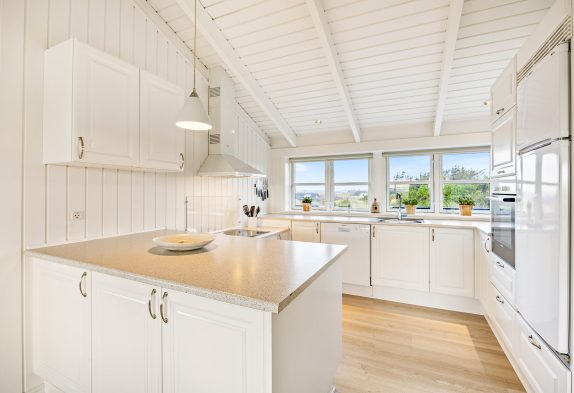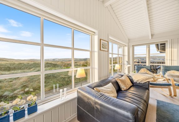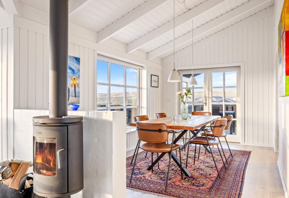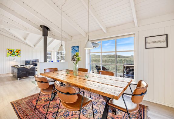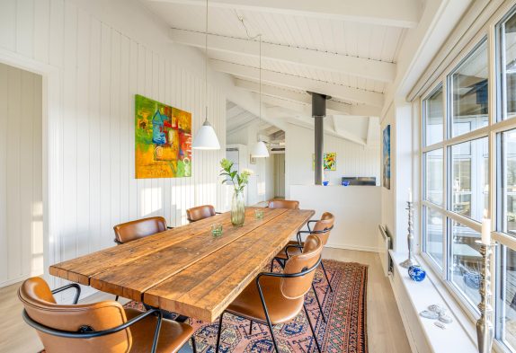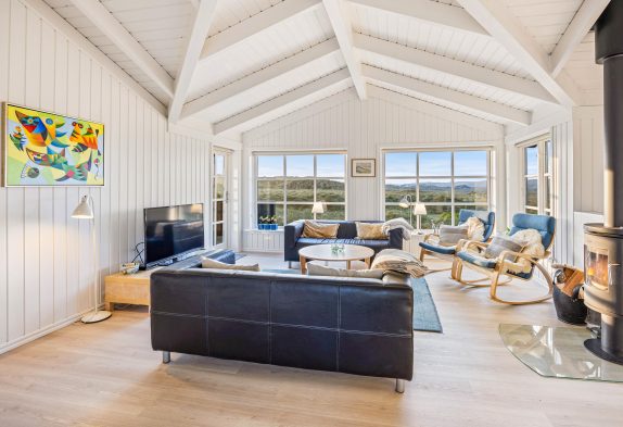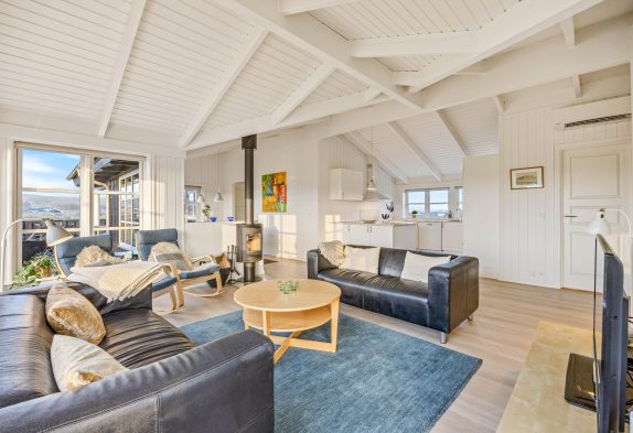 Ein sehr gemütliches und neueres Ferienhaus in Årgab. Das Ferienhaus hat firsthohe, weiße Decken und weiß gestrichene Wänd, zusammen mit der großen Fernsterpartie erscheint das Haus hell und einladend. Die Einrichtung ist sehr geschmackvoll.