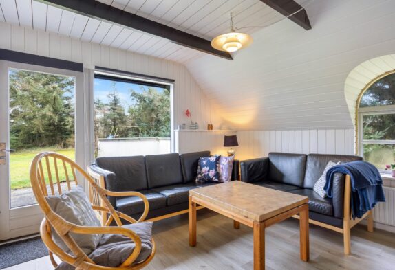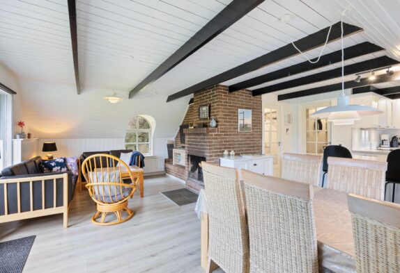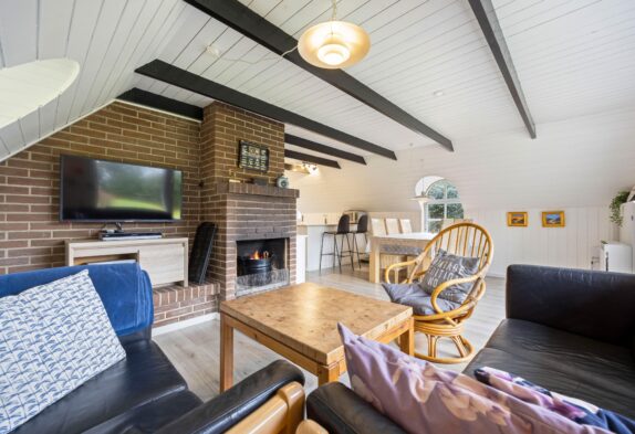 Die Inneneinrichtung mit viel Holz und sorgsam dosierten farbigen Akzenten bildet einen total gemütlichen Rahmen für die schönsten Tage des Jahres. Natürlich fehlt auch ein offener Kamin nicht, so dass man das Haus hier ganzjährig wohlig temperieren kann.