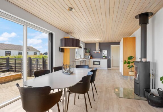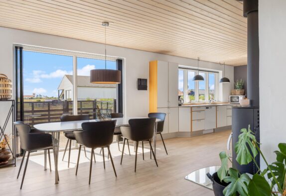 Schönes und geschmackvoll eingerichtetes Ferienhaus mit großen und hellen Räumen. Von der geschlossenen und teilweise überdachten Terrasse hast du einen schönen Blick auf die Weiten und auf den Fjord. Das Haus bietet Platz für 6 Personen und hat Sauna, Whirlpool und drahtlosen Internetzugang.