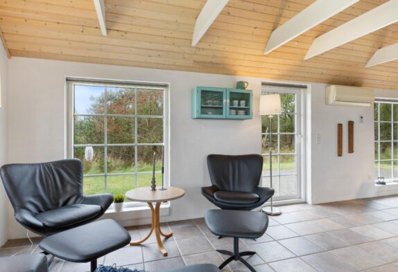 Der Wohnbereich ist gemütlich eingerichtet, der Fliesenboden verfügt über Fußbodenheizung und die Decke hat sichtbare Balken. Kamin, Flachbildschirm-TV, DVD, Radio, kostenloser Internetzugang und eine energiesparende Wärmepumpe stehen auch zur Verfügung. Es gibt 2 Ausgänge zur Terrasse, eine nach Osten und eine nach Westen.