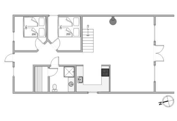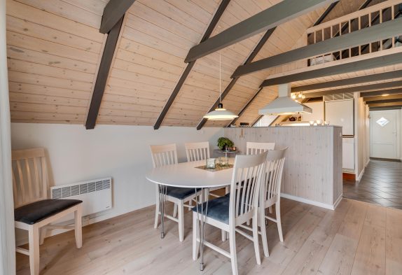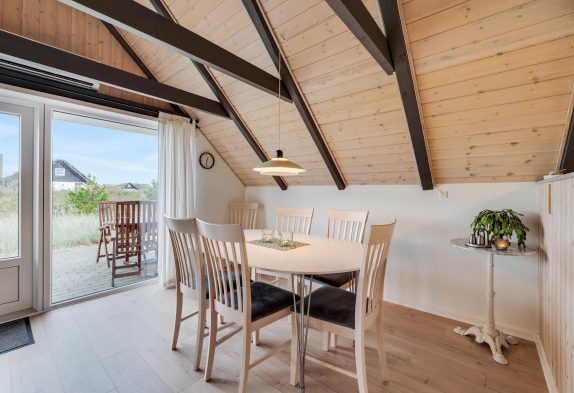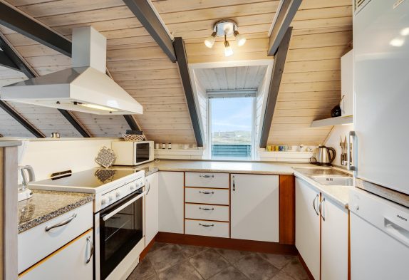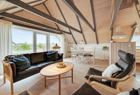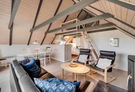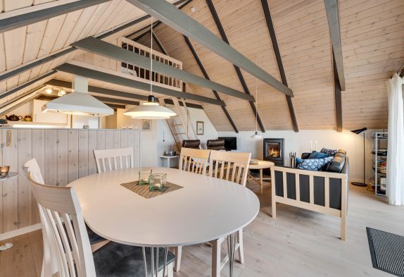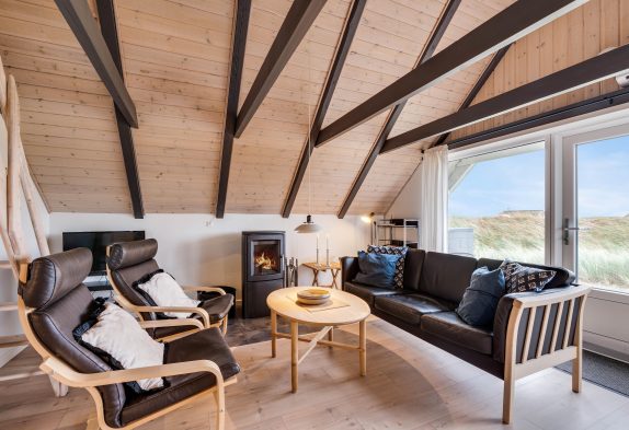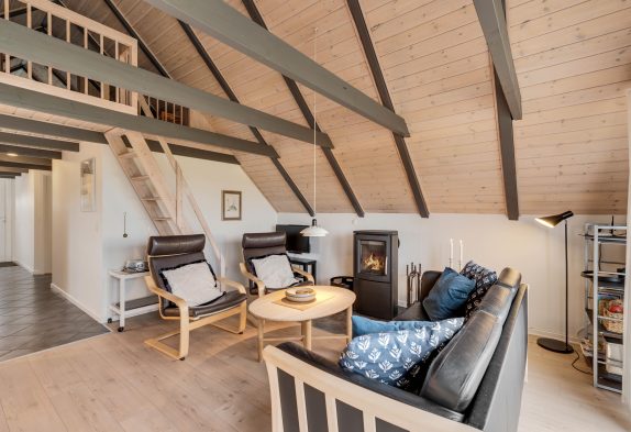 Der gemütliche Wohnbereich hat fisthohe Decken und ist mit der gut ausgestatteten Küche offen verbunden. Und in dem Wohnzimmer sorgt der Kaminofen für Wärme und gemütliche Stimmung. Darüber hinaus hat das Ferienhaus auch freies Internet mit WLAN, Flachbildschirm mit dänischen sowie deutschen Programmen, 2 schöne Doppelschlafzimmer mit Federkernmatratzen und Schränken sowie einen Hängeboden mit zwei Betten.