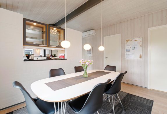 Die Eigentümer dieses schicken Ferienhauses haben bei der Auswahl der Einrichtung viel Wert auf ein harmonisches Gesamtbild gelegt. Aufeinander abgestimmte Farben und liebevolle Details sorgen für ein gemütliches Ambiente und schaffen einen Wohlfühlort. Auf der bequemen Couch kann die ganze Familie zusammenkommen und gemeinsam Filme schauen. Der knisternde Kamin sorgt dabei für Wärme und eine entspannte Atmosphäre. Natürlich könnt ihr auch die energiesparende Wärmepumpe zum Heizen nutzen.