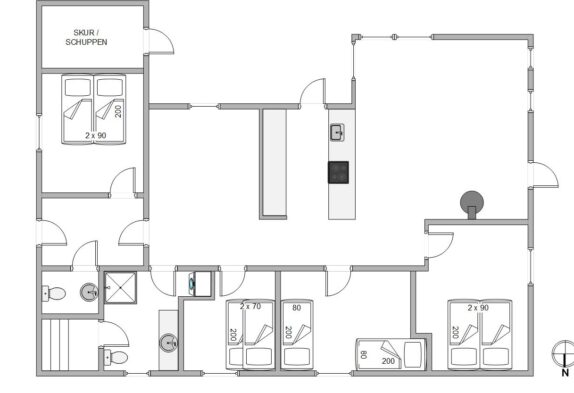 Im großen Bad findet ihr auch eine Dusche sowie einen Trockner und eine Waschmaschine, falls ihr Wäsche waschen wollt oder müsst. Um Wartezeiten zu vermeiden, verfügt dieses praktisch ausgestattete Ferienhaus auch über ein Gäste-WC. Eure Familie oder Freundesgruppe kann sich hier auf insgesamt 4 gemütliche Schlafzimmer aufteilen. Für kleine Kinder stehen auch noch ein Reisebett und ein Hochstuhl bereit. Hier wurde an alles gedacht, um euch einen schönen und entspannten Urlaub zu bereiten.