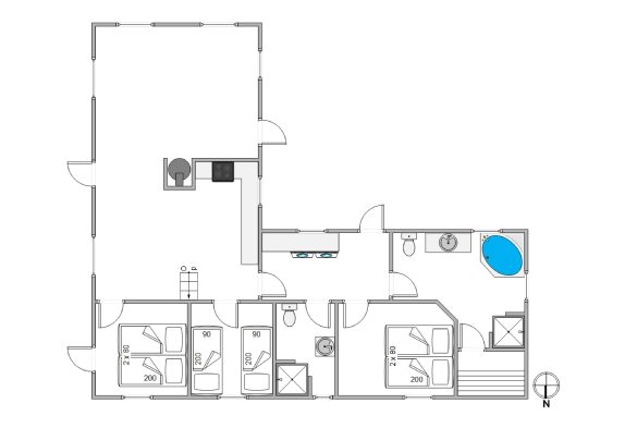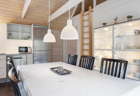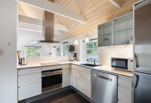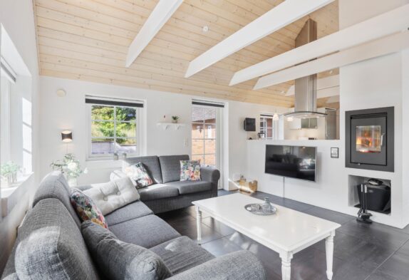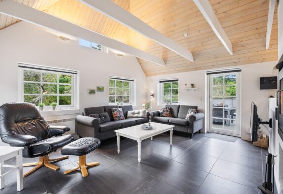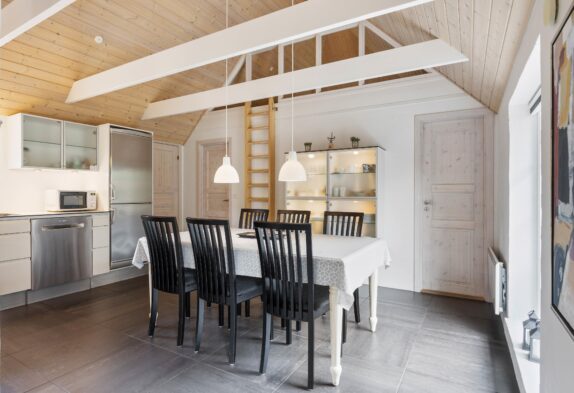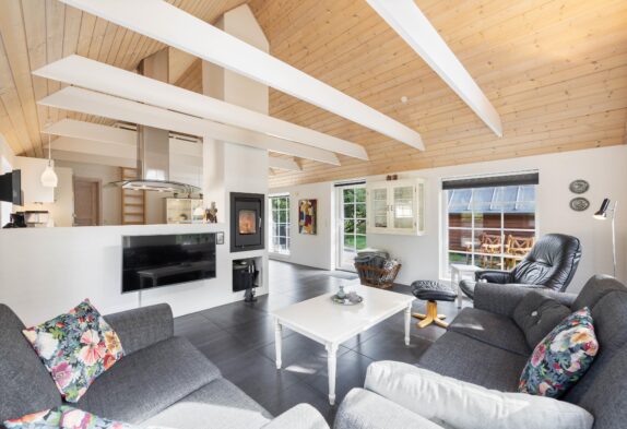Das Badezimmer ist groß, hell und schick mit einem Whirlpool und Sauna eingerichtet. Genau richtig für ein paar entspannende Stunden nach einem schönen langen Tag am Meer. Das Wohnzimmer, die Küche und das Esszimmer sind offen miteinander verbunden, somit hat man einen sehr schicken, großen Raum mit firsthoher Decke, wo die ganze Familie zusammen Zeit verbringen kann. Macht den Kaminofen an und genießt die sich verbreitende Wärme und Gemütlichkeit.