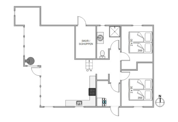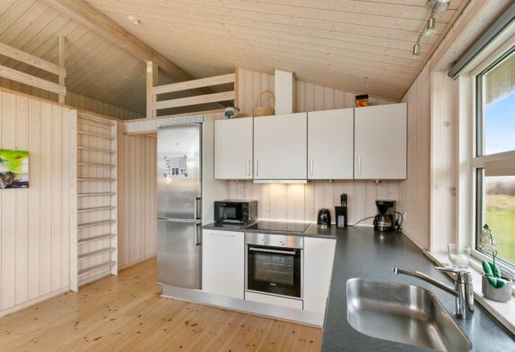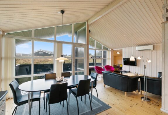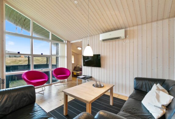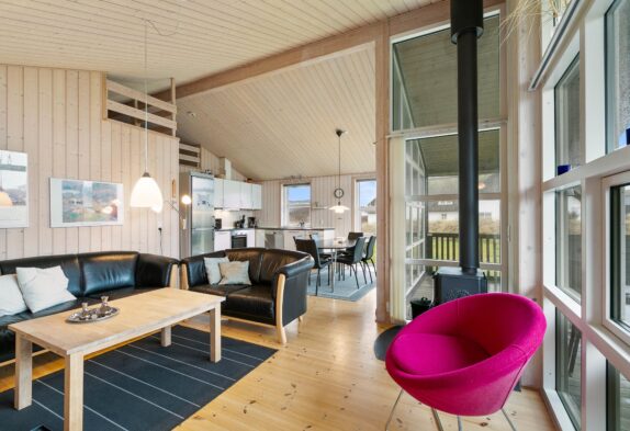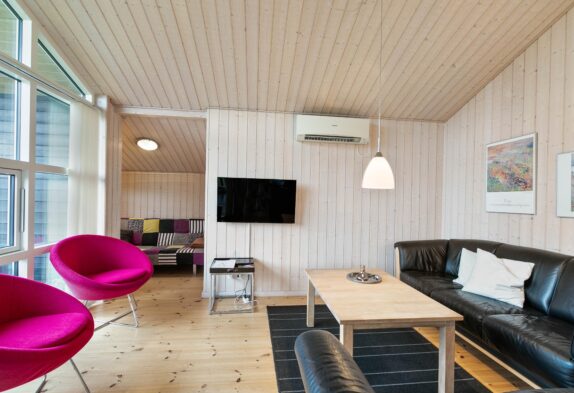 Ein hervorragendes und gemütliches Ferienhaus mit 74 m2. Im ganzen Haus sind helle Holzböden; nur im Bad sind Fliesen. Die beiden Schlafzimmer sind mit Doppelbetten eingerichtet; darüber hinaus befindet sich ein Schlafsofa für 2 Personen im Alkoven, welcher in der nordwestlichen Ecke des Wohnzimmers liegt.