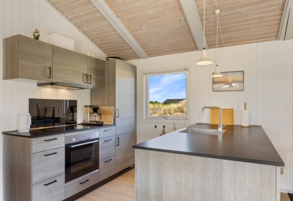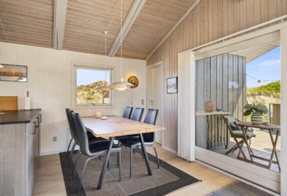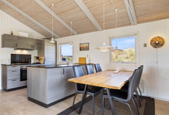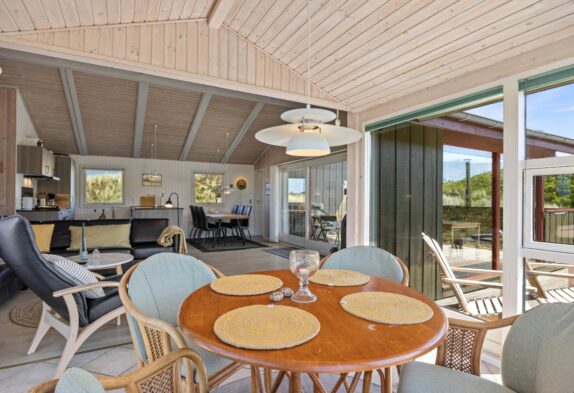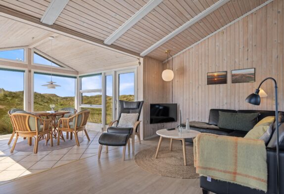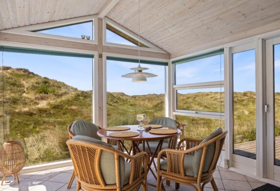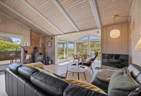 Das Ferienhaus ist gemütlich und charmant eingerichtet und verfügt über einen schönen Wintergarten mit großen Glasflächen, die viel Sonnenlicht hereinlassen und von wo aus ihr einen schönen Blick auf die Dünen genießen könnt, während die Sonne untergeht. Das Haus ist gepflegt und mit Holzvertäfelungen verkleidet, die eine echte Ferienhausatmosphäre erweckt. Darüber hinaus sorgt der Kaminofen auch an kühleren Tagen für Gemütlichkeit und Wärme.