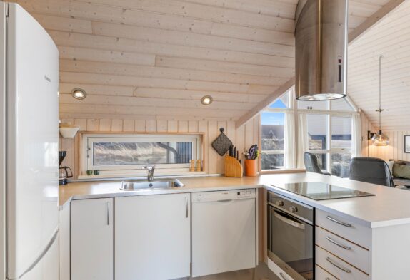In der Küche, welche mit dem Wohnzimmer verbunden ist, findet Ihr u.a. Geschirrspüler, Mikrowelle und einen 60 Liter Gefrierschrank vor. Das Wohnzimmer hat große und schicke Fensterpartien nach Westen und Süden, so dass Ihr eine schöne Aussicht auf die schöne Natur und Dünen habt.