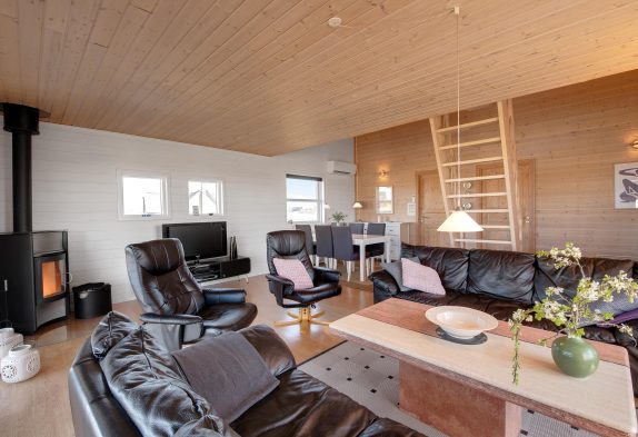 Im westlichen Bereich des Hauses ist das Wohnzimmer mit gemütlichen Möbeln ausgestattet. Von hier habt Ihr eine schöne Aussicht nach Westen und Osten über die Heidelandschaft.