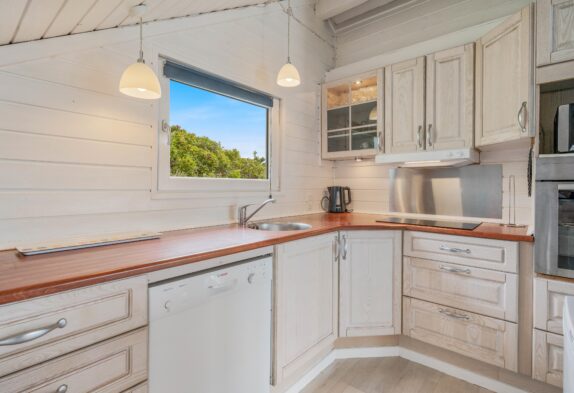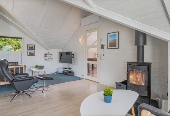 Die geräumige Küche ist offen im Wohnraum mit Kaminofen integriert – so können alle beim Zubereiten einer leckeren Mahlzeit mithelfen und gemütliche, gemeinsame Momente verbringen. Über eine Bluetooth-Verbindung könnt ihr sogar eure Lieblingsmusik hören.