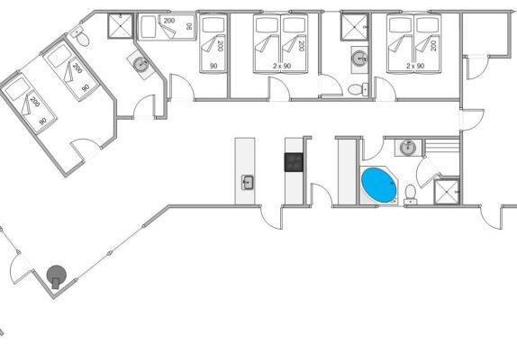 Das Haus ist sehr hell und modern eingerichtet. Die offene Küche ist mit dem Wohnraum verbunden, wo sich die ganze Familie beim Essen machen oder Film schauen sammeln kann. Macht euch Abends den Kamin an, während ihr den Tag vielleicht mit einem Gemeinschaftsspiel ausklingen lasst. Es gibt vier schöne Schlafräume mit eigenem Fernseher. Zwei Zimmer sind mit einem Doppelbett und zwei Räume sind mit jeweils zwei Einzelbetten ausgestattet. Eins der Zimmer mit Doppelbett, hat auch den direkten Zugang zu einem der drei Badezimmer. Den Whirlpool findest du im großen Badezimmer, wo du nach einem langen und aktiven Tag richtig entspannen kannst und auch den Zugang zur Sauna hast du von diesem Badezimmer aus.